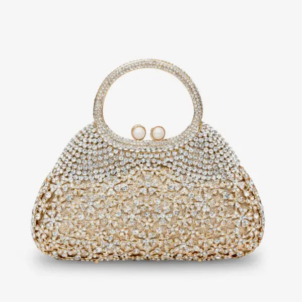 Make every outfit sparkle with the Serenna, a rhinestone-covered minaudière with a polished ring handle and pearl-style kiss-lock. Lined in soft vegan leather, this crystal clutch is made for weddings, cocktail parties, and formal nights—glam shine with just the right size for essentials.